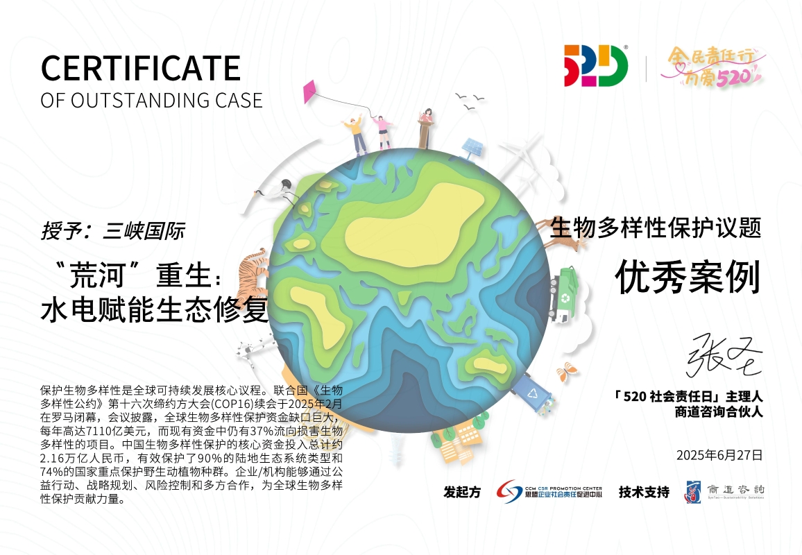 6月27日,由思盟企業社會責任促進中心發起的2025年「520社會責任日」仲夏夜活動在京成功舉辦。會上揭曉了2025年「520社會責任日」七大議題優秀案例的評選結果,三峽國際連續第二年榮獲生物多樣性保護議題優秀案例。